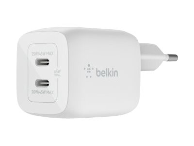 Belkin BoostCharge Pro GaN - Verkkosovitin - PPS ja GaN-teknologia - 45 watti(a) - Fast Charge, PD 3.0 - 2 lähtöliittimet (2 USB-C:tä) - valkoinen