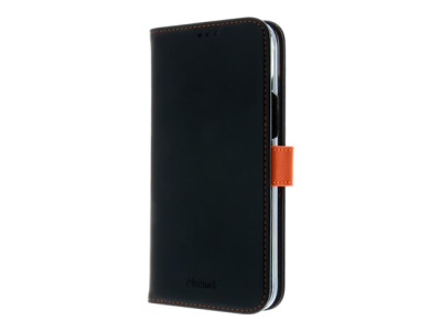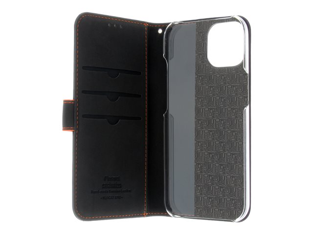 Insmat Exclusive - Läppäkansi matkapuhelimelle - aito nahka, polykarbonaatti, kartonki + paperi + alumiinifolio, puuvillaompeleet - musta/oranssi malleihin Apple iPhone 15 Plus