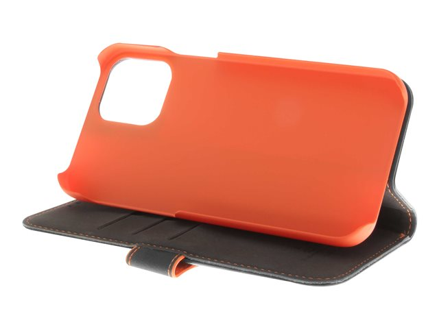 Insmat Exclusive - Läppäkansi matkapuhelimelle - nahka, kartonki + paperi + alumiinifolio - musta/oranssi malleihin Apple iPhone 11 650-2967