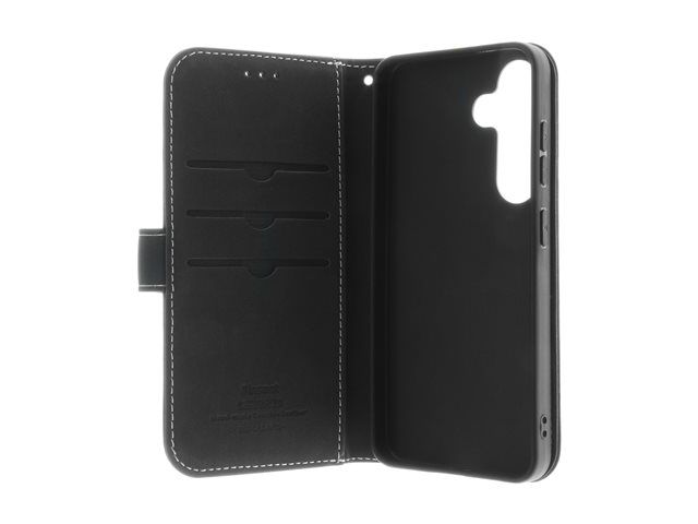 Insmat Exclusive - Läppäkansi matkapuhelimelle - nahka, kartonki + paperi + alumiinifolio, termoplastinen polyuretaanikehikko (TPU), puuvillaompeleet - musta malleihin Samsung Galaxy S24+