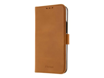 Insmat - Läppäkansi matkapuhelimelle - nahka, polykarbonaatti, kartonki + paperi + alumiinifolio, puuvillaompeleet - ruskea malleihin Apple iPhone 14 Pro