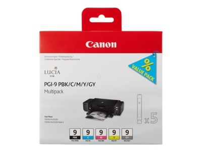 Canon PGI-9 PBK/C/M/Y/GY Multi-Pack - 5 pakettia - harmaa, keltainen, sinivihreä, magenta, valokuvamusta (photo black) - alkuperäinen - mustesäiliö malleihin PIXMA iX7000, MX7600, Pro9500, Pro9500 Mark II