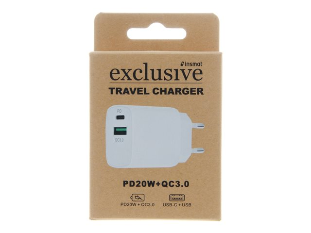 Insmat travel charger - Verkkosovitin - 20 watti(a) - 3 A - PD 3.0, QC 3.0 - 2 lähtöliittimet (USB, 24 pin USB-C) malleihin Apple 10.2-inch iPad (8. sukupolvi); 10.9-inch iPad Air (4. sukupolvi, 5th generation) 530-9200